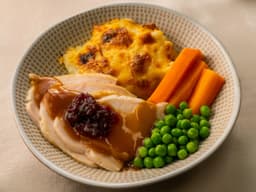 INDIVIDUAL SERVE | Succulent roast turkey with mouth-watering gravy and sweet cranberry sauce. Served with creamy potato bake, steamed carrots and garden peas.