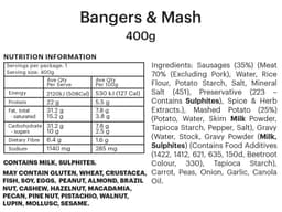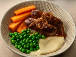 Sausage, Mashed Potatoes, Gravy [Water, Reserved stock (Lamb, Beef, or Chicken), Gravy powder (Milk, Sulphites), Starch], Roast carrot batons, Peas, Brown onion