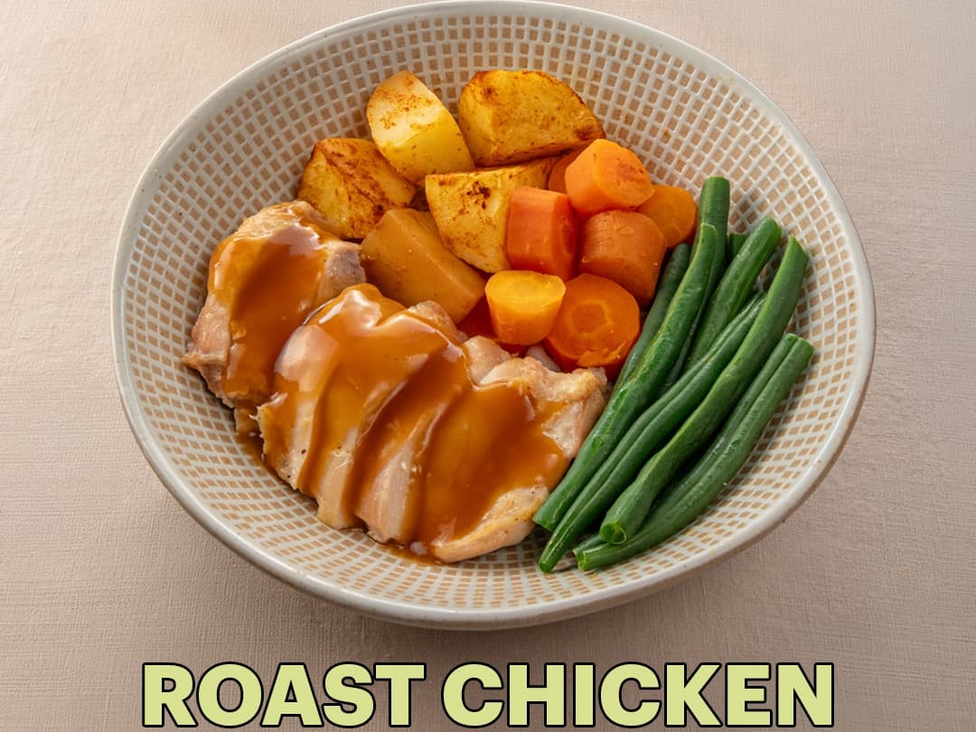 INDIVIDUAL SERVE | Succulent roast chicken with rich gravy, golden roast potatoes, sweet carrot rings and fresh green beans.