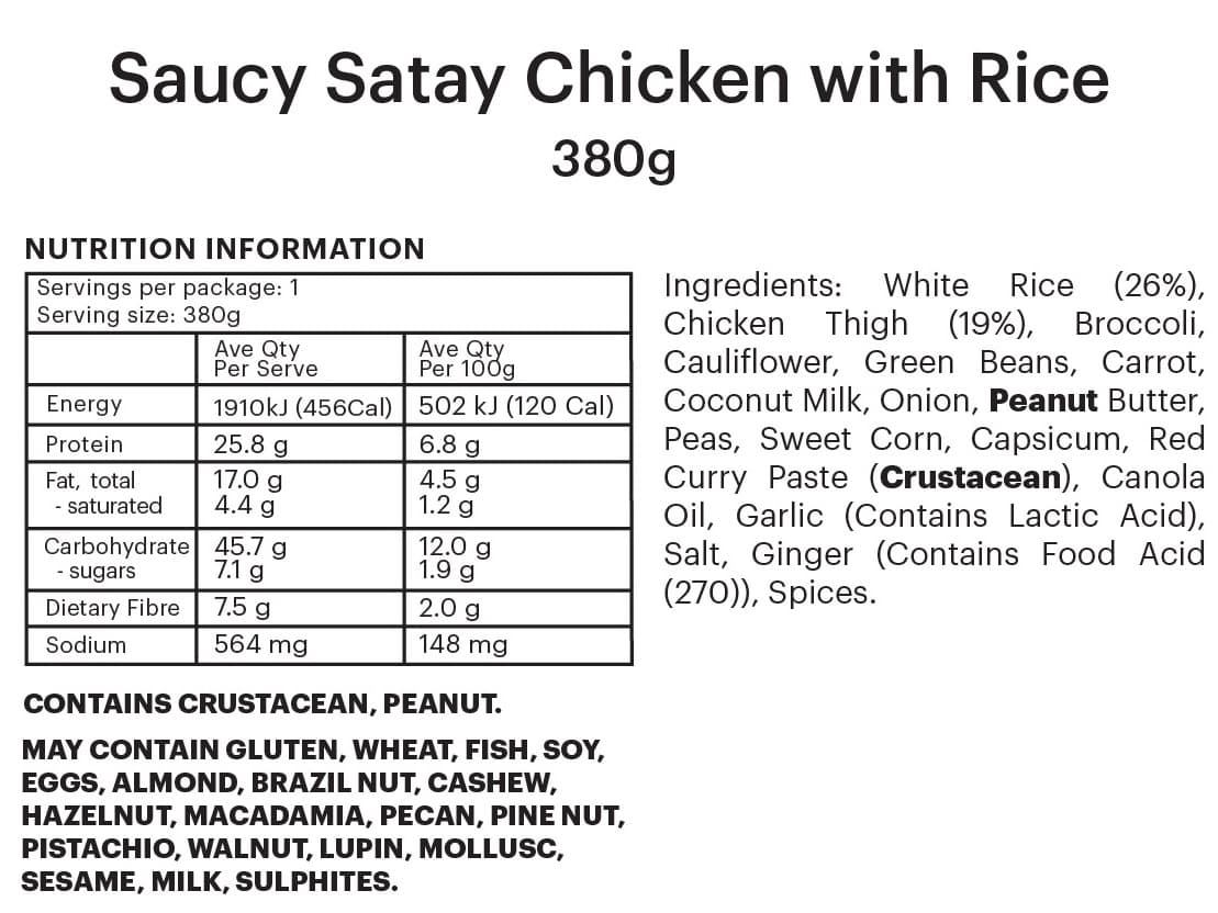 INDIVIDUAL SERVE | Flavourful and saucy satay chicken with mixed vegetables, served with rice, broccoli and cauliflower.