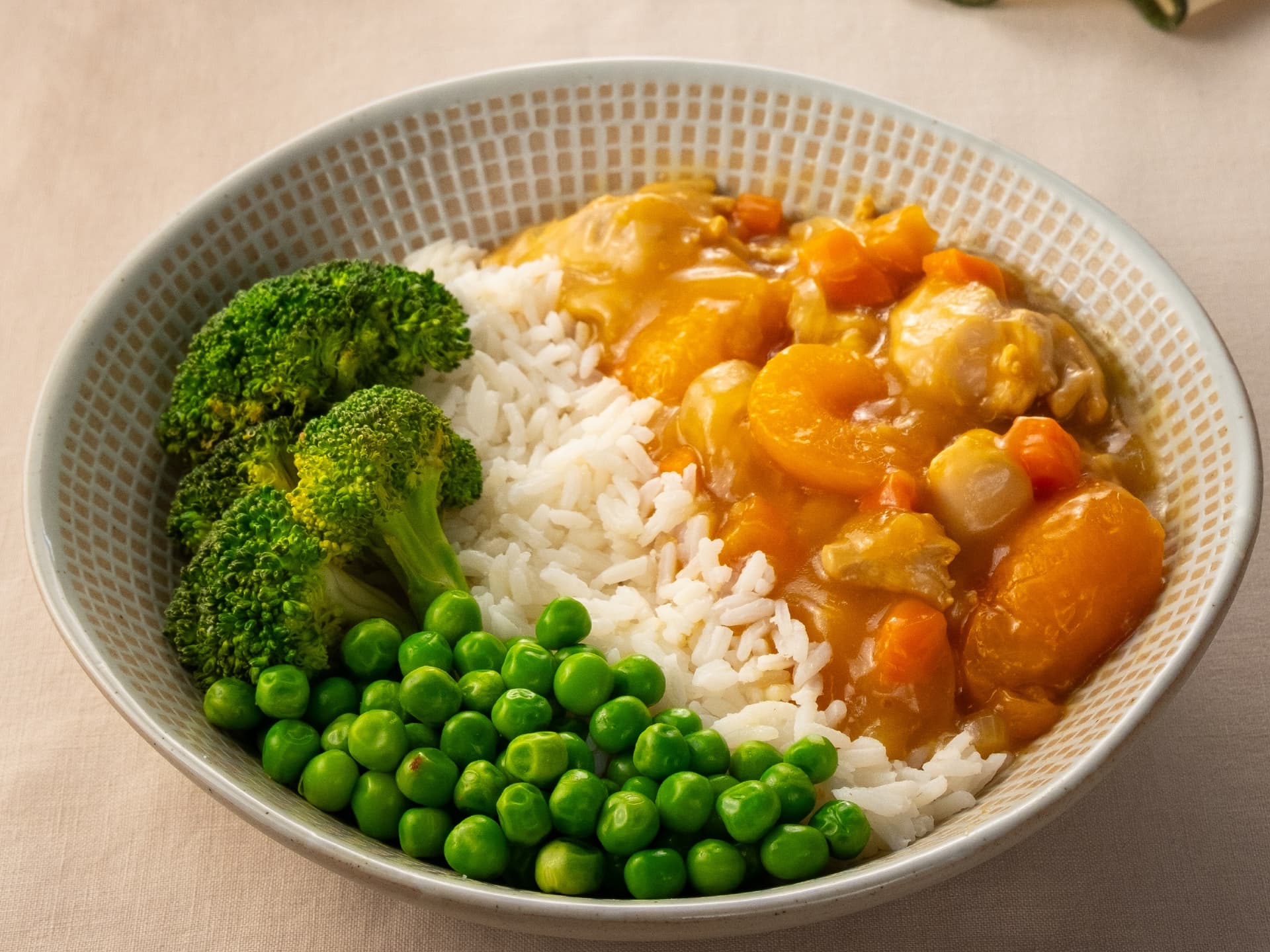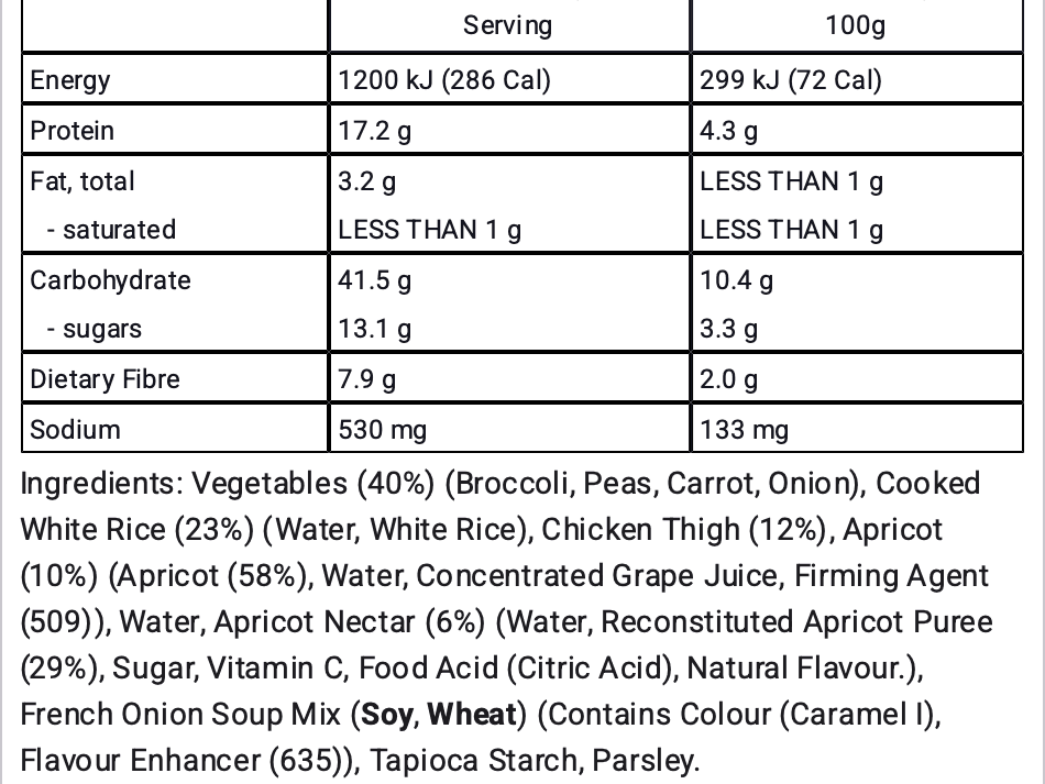 INDIVIDUAL SERVE | Tender chicken in a golden apricot glaze, served with rice, peas and broccoli.