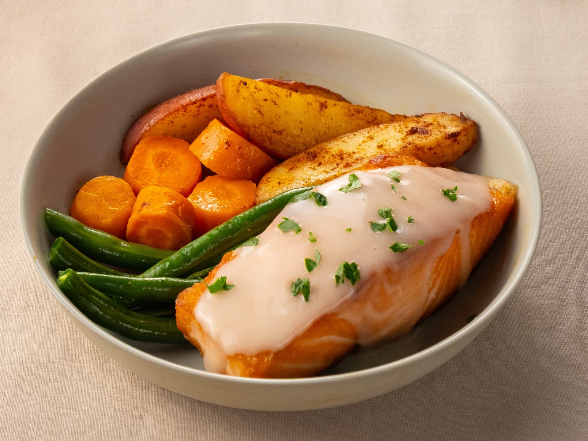 SMALLER SINGLE SERVE | Tender baked salmon with lemon sauce, golden potatoes, sweet carrot rings and fresh green beans.