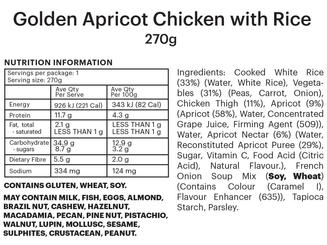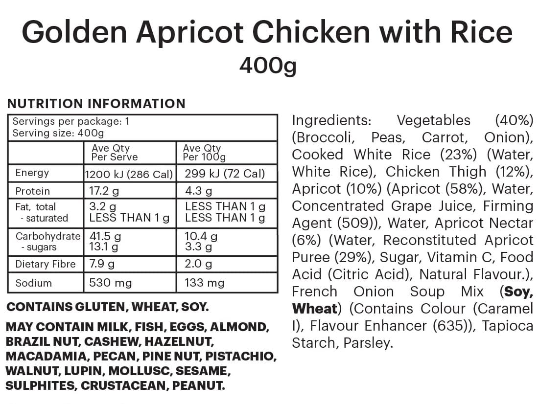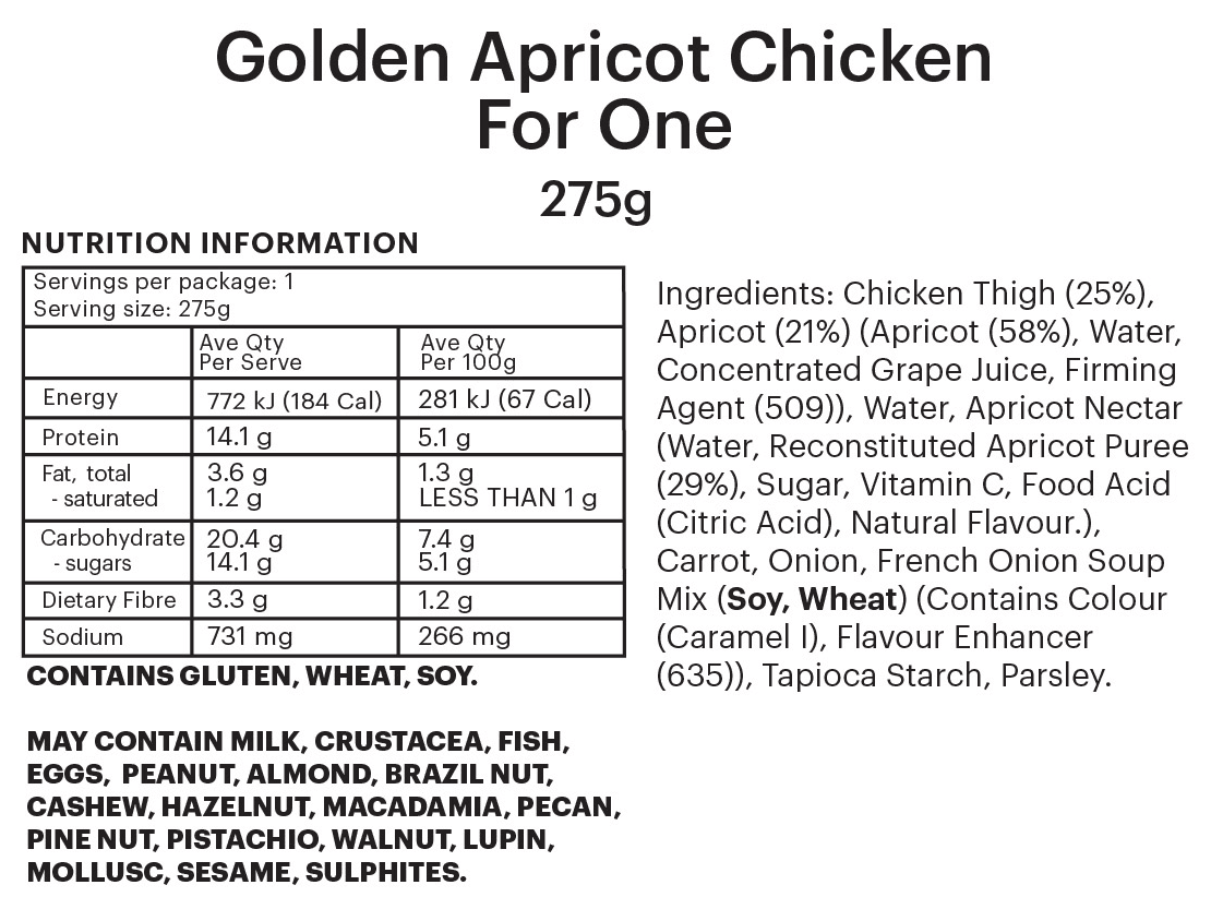 INDIVIDUAL SERVE | Tender chicken in a golden apricot glaze, served with rice, peas and broccoli.