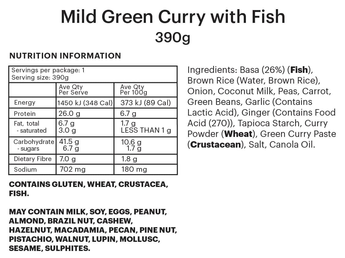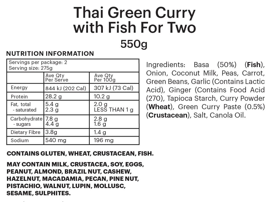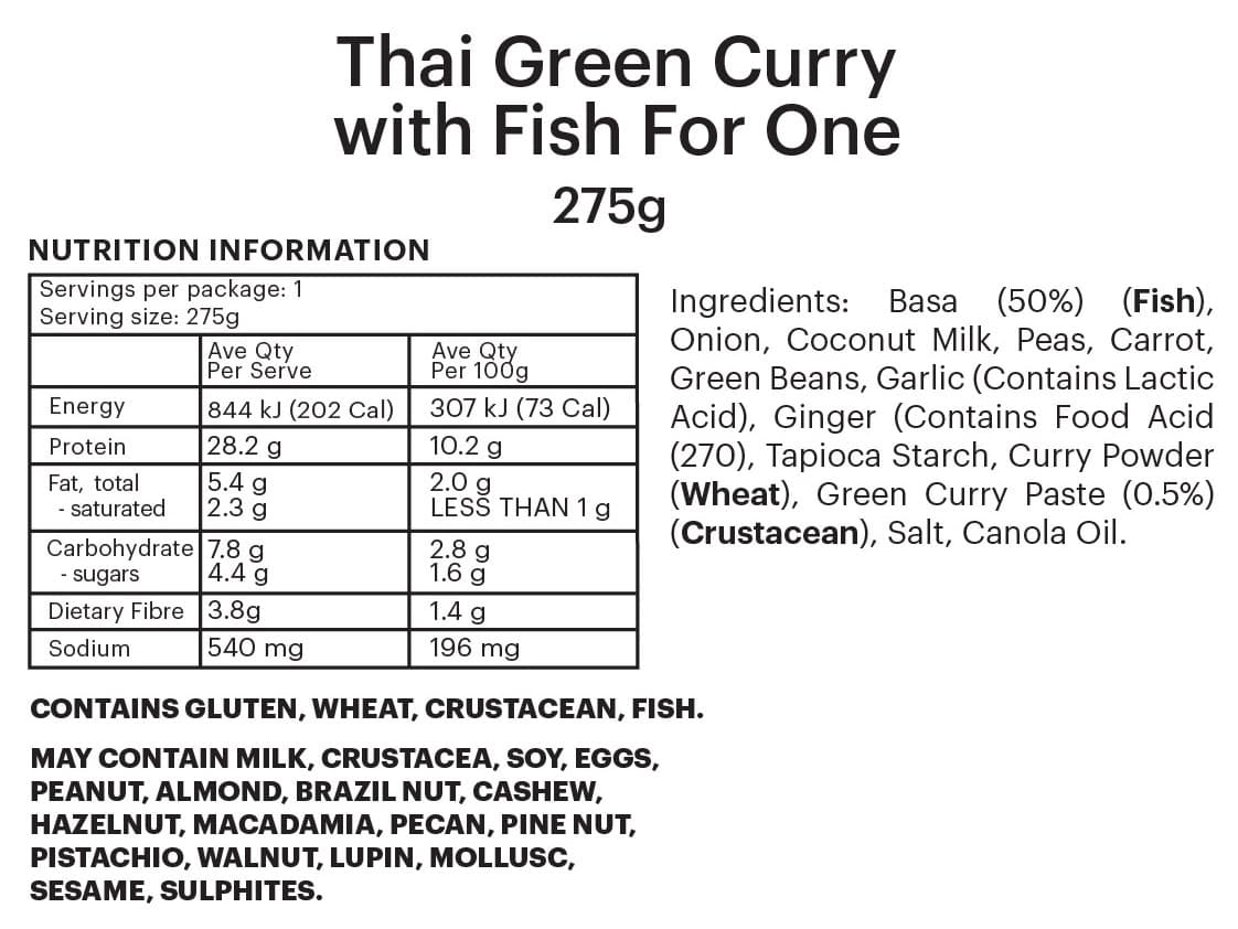 PREMIUM FOUNDATION | Tender Fish in a Mild Thai Green Curry Sauce. Two different size options to meet your needs. Add your own steamed rice and vegetables to complete your tasty meal.