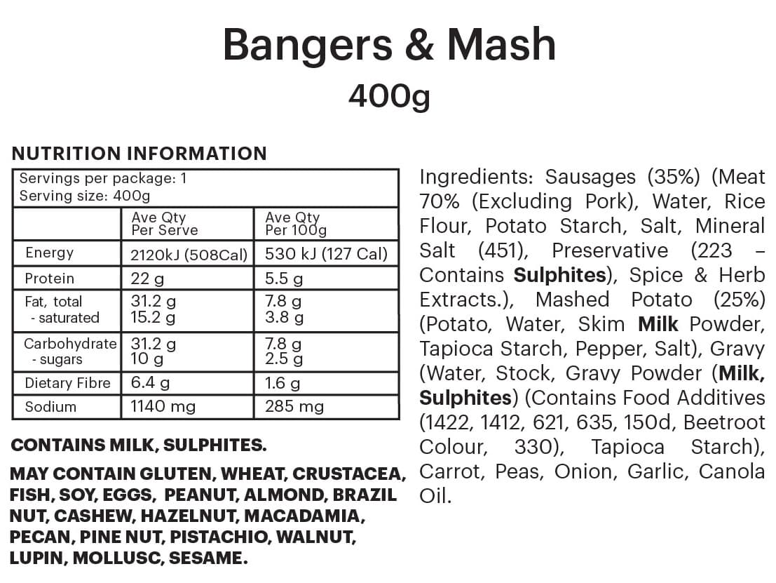 INDIVIDUAL SERVE | Two savoury sausages drizzled in homestyle gravy, served with fluffy potato mash, carrots and peas.