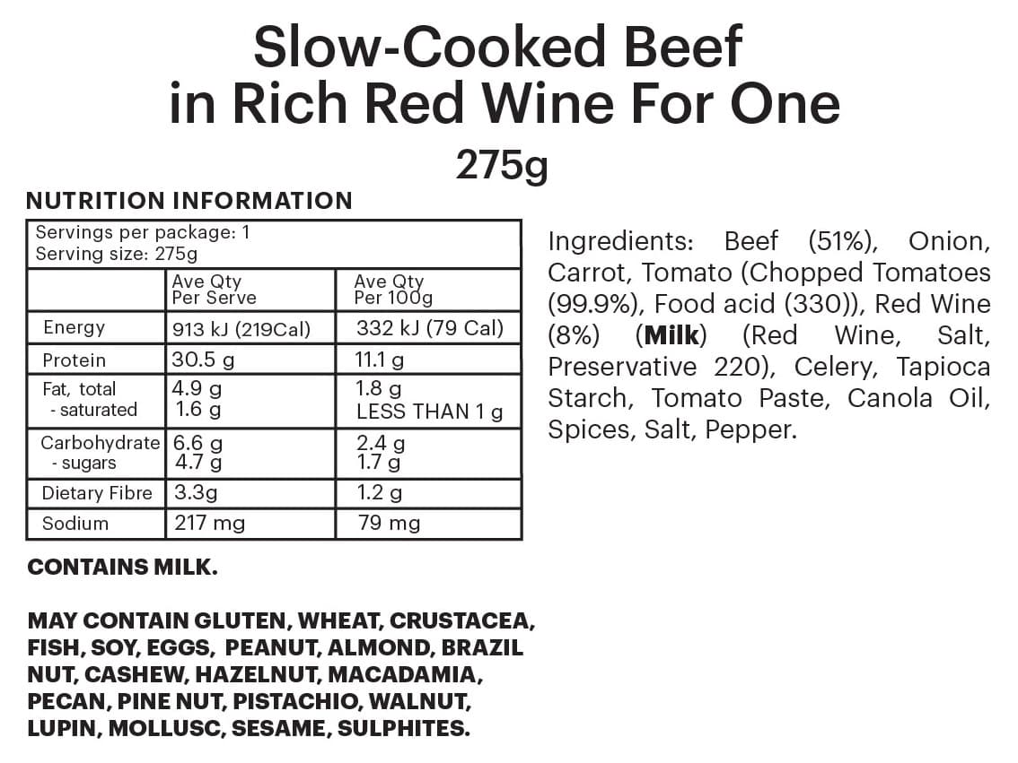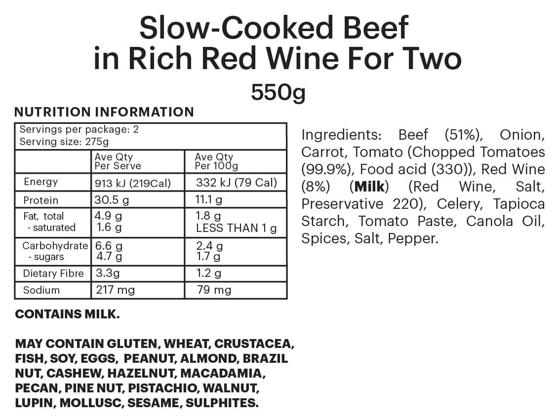 PREMIUM FOUNDATION | Hearty slow-cooked beef in rich red wine sauce. Two different size options to meet your needs. Add your own mash potato and fresh vegetables to make a wholesome savoury meal.