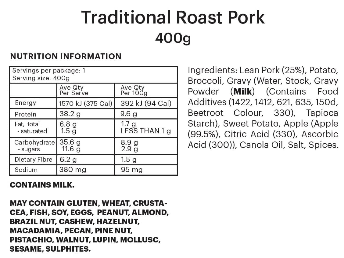 INDIVIDUAL SERVE | Homestyle roast pork with rich gravy, golden potatoes, sweet roast potato, broccoli and diced apple.