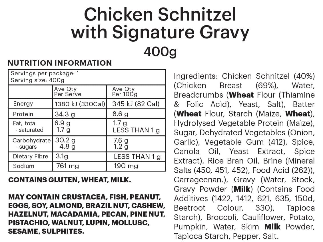 INDIVIDUAL SERVE | Crisp, golden chicken schnitzel with rich, homestyle gravy, served with broccoli, cauliflower and pumpkin mash.