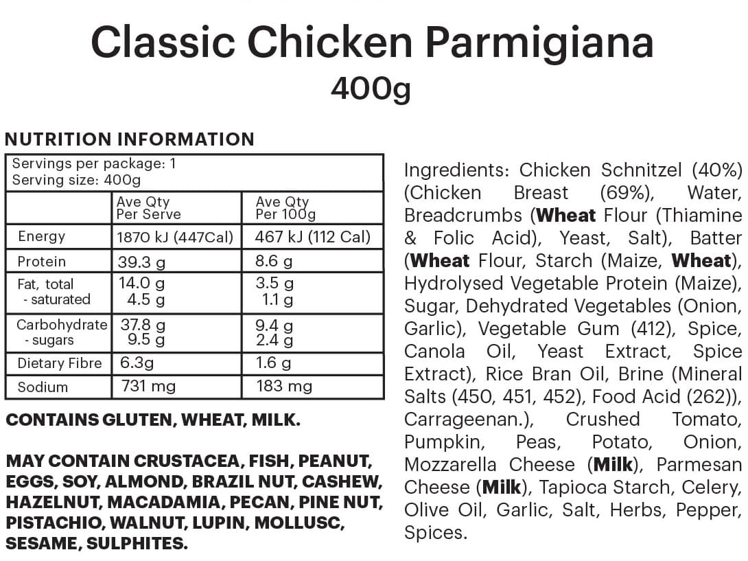 INDIVIDUAL SERVE | Crumbed tender chicken schnitzel topped with flavourful tomato sauce and melted cheese, served with roast potato, pumpkin and peas.