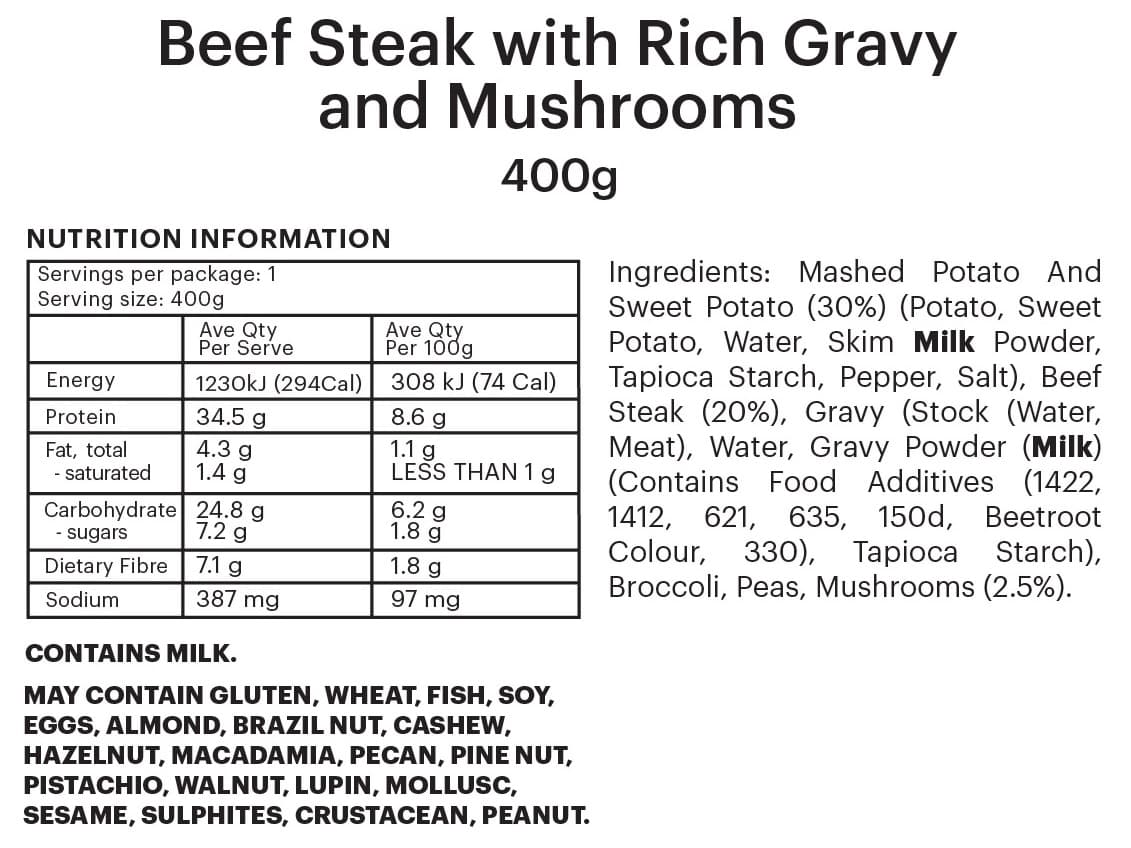 INDIVIDUAL SERVE | Tender beef steak served with rich gravy, mushrooms, and a side of sweet potato mash, broccoli and peas.