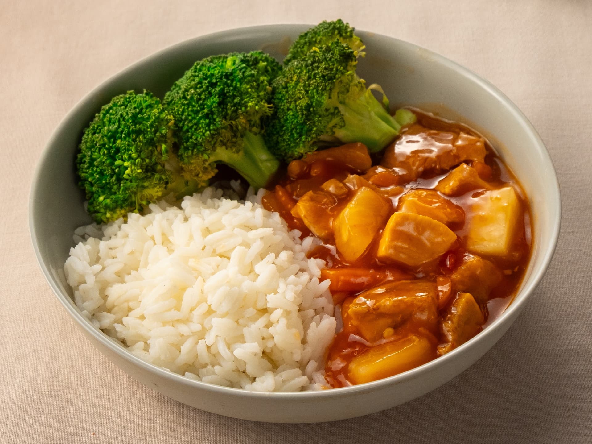 SMALLER SINGLE SERVE | Delicious sweet and sour pork served with fluffy rice and crisp broccoli.