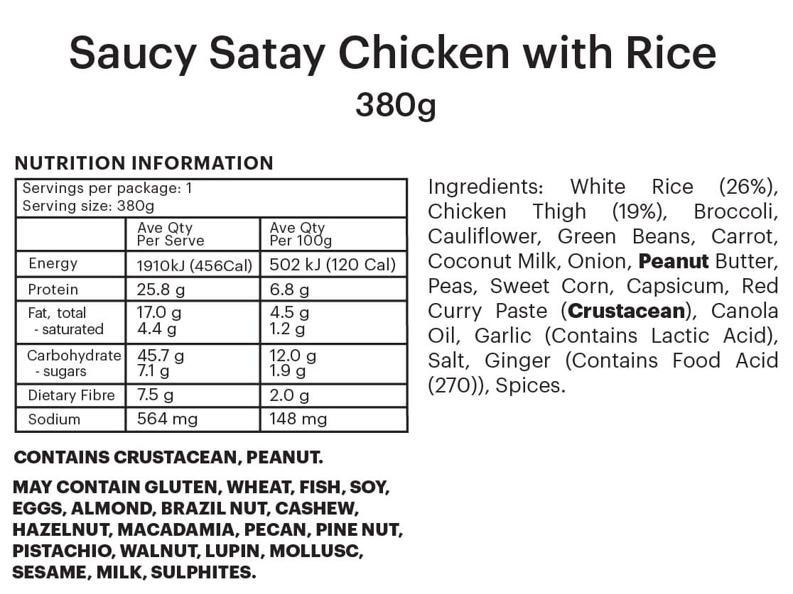 INDIVIDUAL SERVE | Flavourful and saucy satay chicken with mixed vegetables, served with rice, broccoli and cauliflower.