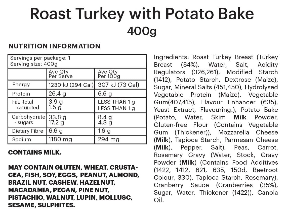 INDIVIDUAL SERVE | Succulent roast turkey with mouth-watering gravy and sweet cranberry sauce. Served with creamy potato bake, steamed carrots and garden peas.