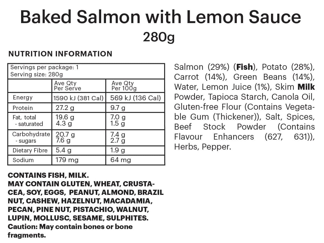 INDIVIDUAL SERVE | Tender baked salmon with lemon sauce, golden potatoes, sweet carrot rings and fresh green beans.