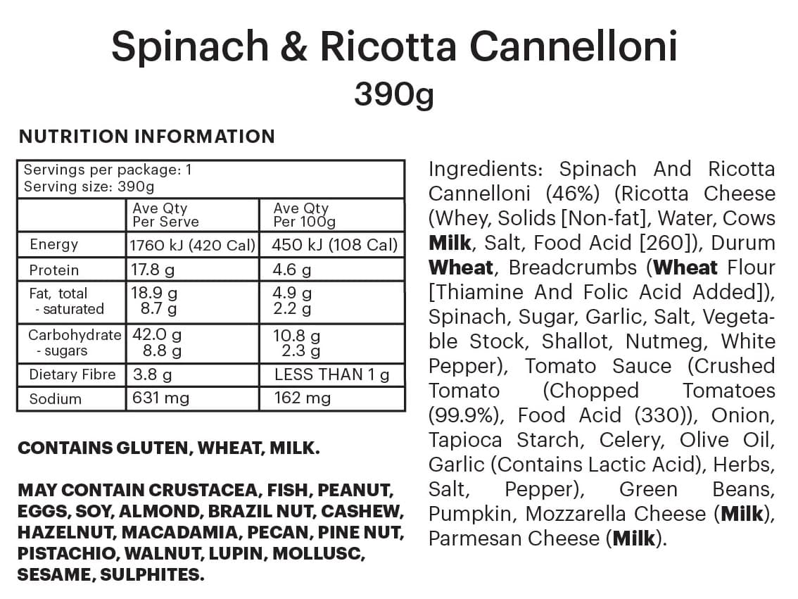 INDIVIDUAL SERVE | Comforting spinach and ricotta cannelloni in tomato sauce, with golden baked pumpkin and fresh green beans.