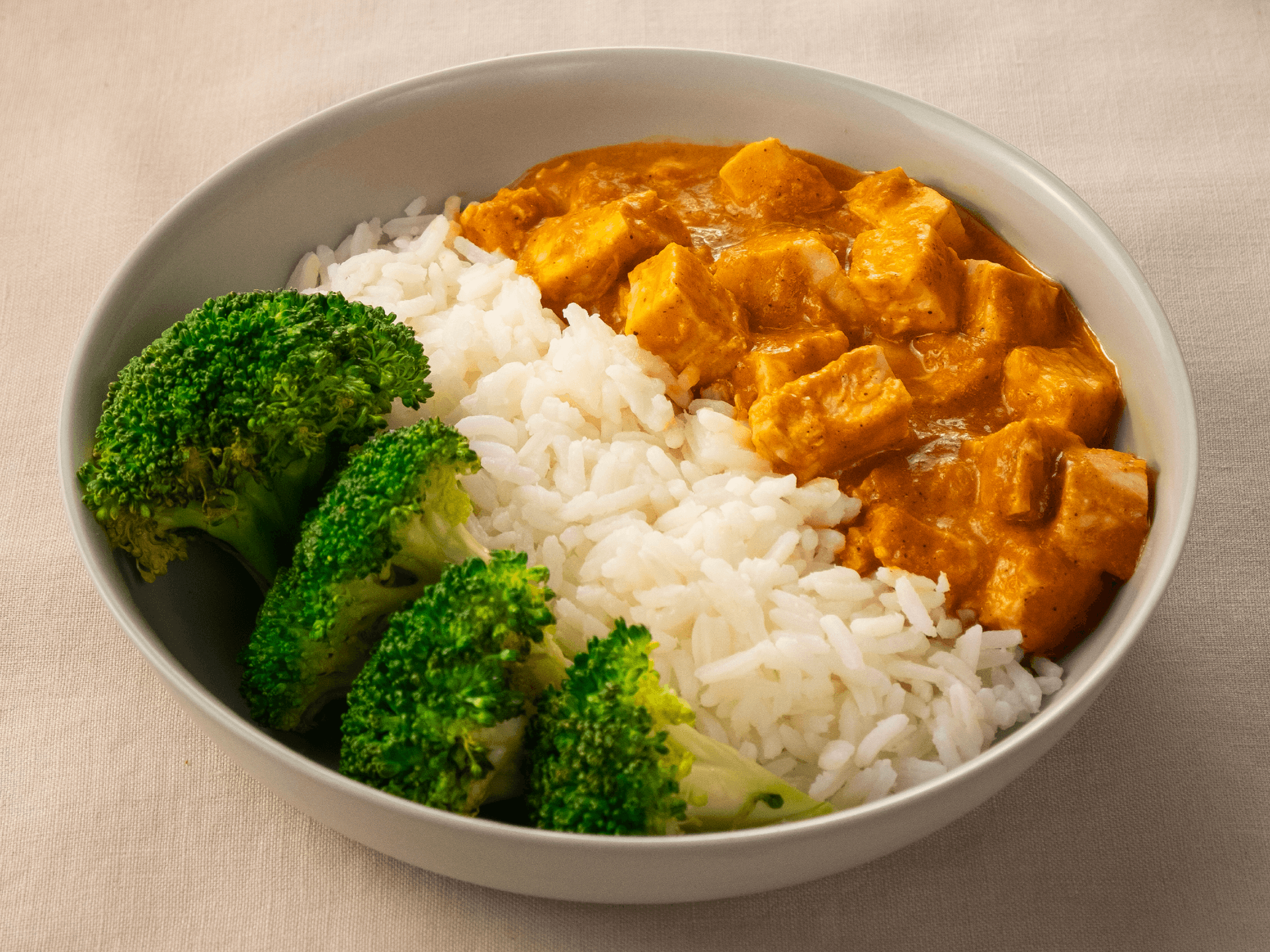 SMALLER SINGLE SERVE | The perfect combination of succulent chicken with a touch of spice and luscious creamy sauce. Served with steamed basmati rice and broccoli.