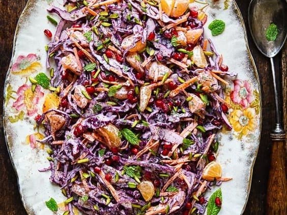w/ Shredded Red Cabbage, Carrot, Red Onion, Fresh Dill + Parsley, Mandarines, Candied Paprika Walnuts + Sour Cream Dressing