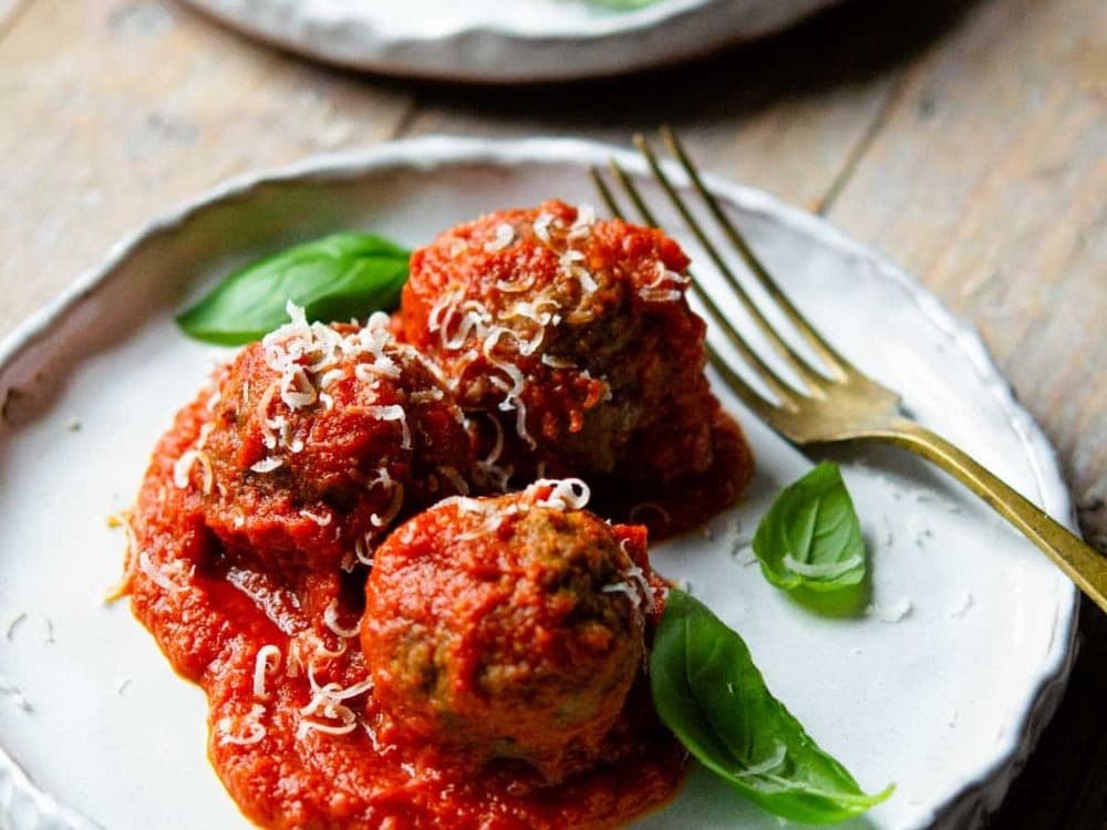 Lamb polpette with cauliflower rice, minted peas, blistered cherry tomatoes, Brussels Sprouts + Sicilian tomato herb sauce