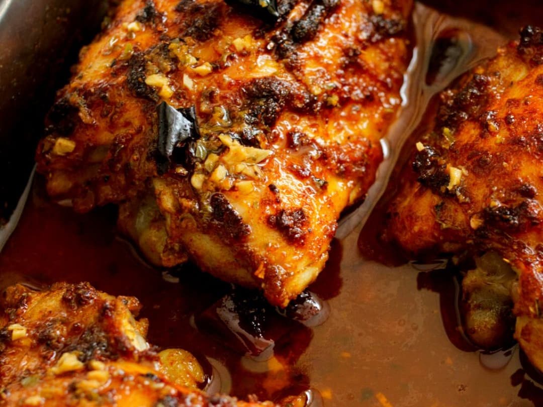 Paprika chicken thighs with garlic cannellini mash, roasted carrot ribbons, grilled zucchini, wilted silverbeet + lemon thyme jus