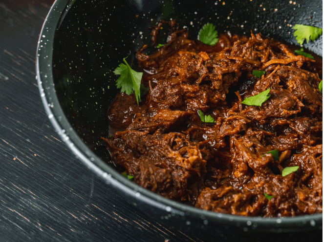 Tender, slow-cooked beef marinated in a rich blend of traditional Mexican spices, including smoky cumin, garlic, and chili. Bursting with bold, savoury flavours. Add fresh cilantro, onions, and a wedge of lime for an authentic finishing touch.