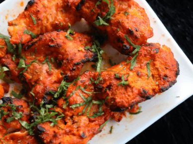 Chicken marinated in a tandoori paste and topped with spiced lemon yoghurt sauce then grilled.