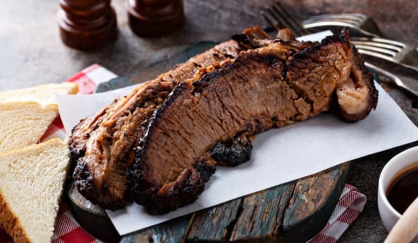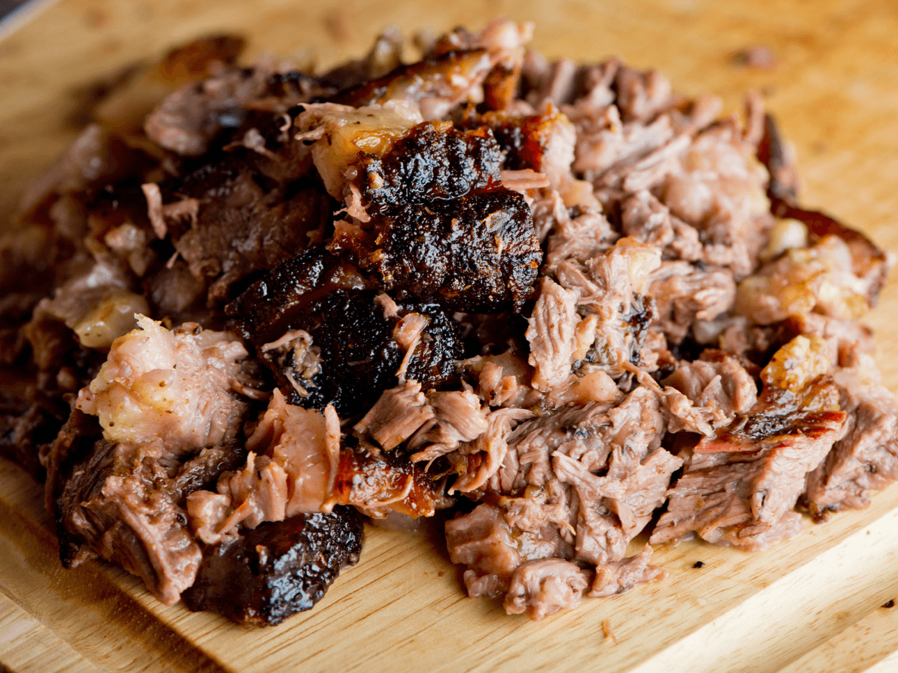 Soft and tender pulled brisket with a delicious smoky rub and bbq sauce served with mash potato.