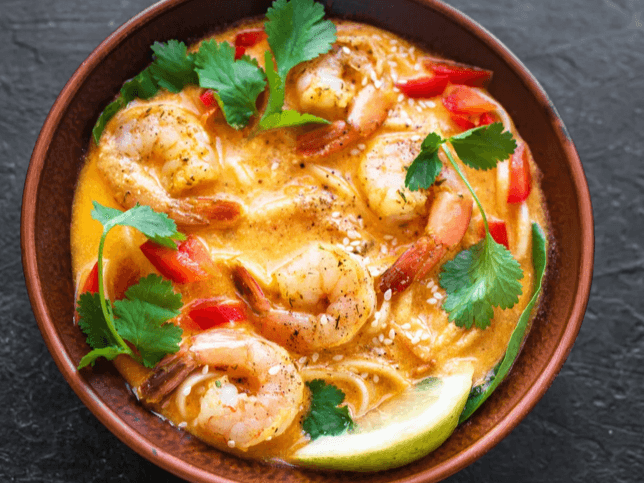A rich coconut and red curry flavourful and spicy coconut curry broth filled with fresh veggies, thick rice noodles, chicken, calamari and plump prawns!