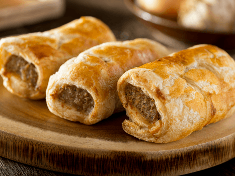 Ingredients: Pastry: flour (rice, soy, tapioca, maize, potato), Nuttelex margarine, eggs, canola oil, baking powder (glucono delta-lactone (575), potassium bicarbonate (501), sodium bicarbonate (500)), salt, xanthan gum (415), guar gum (412). Filling: gluten free sausage meat, onion, carrot, gluten free breadcrumbs, parsley, eggs, salt, pepper.
