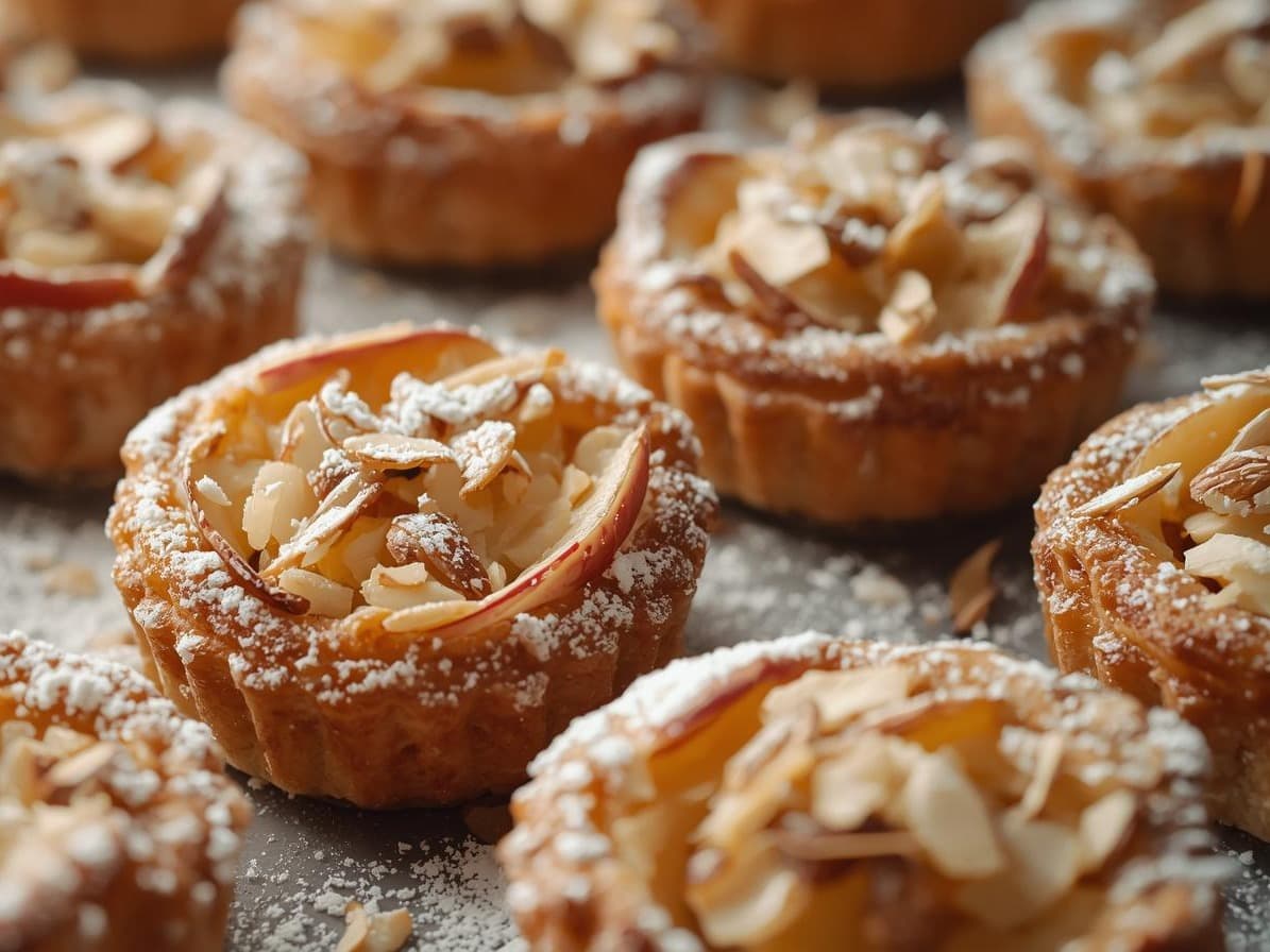 Homemade gluten-free shortcrust pastry shells filled with brown sugar almond frangipane, apple slices & flaked almonds. A recipe from The Very Hungry Coeliac.