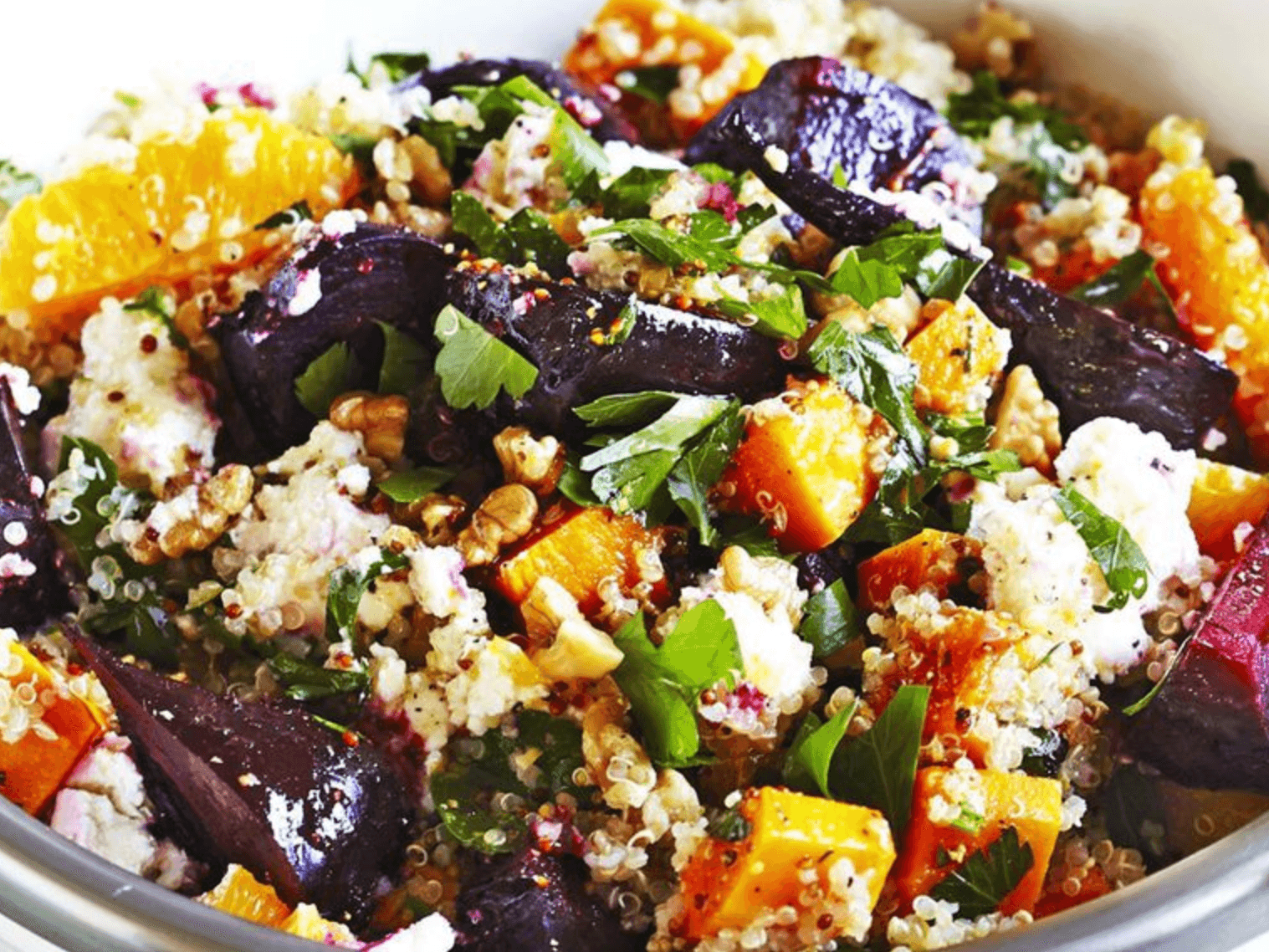 Beetroot, Carrots, Goat's cheese (Milk), Orange Lemon Dressing [Extra virgin olive oil, Orange juice, Lemon juice, Dijon mustard, Salt flakes, Black pepper], Red quinoa, Maple syrup, Hazelnuts, Extra virgin olive oil, Mint, Parsley, Salt flakes, Black pepper, Cumin ground, Coriander ground
