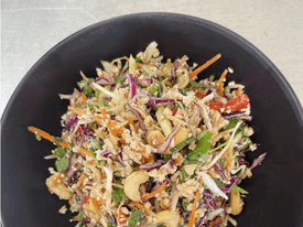 This dish originates from the streets of Laos, and we have put our own twist to it using free range chicken, lime and cashews. Loaded with fresh herbs and a hint of chilli. A healthy light meal, and delicious munched down cold. Low in carbs and jam-packed full of nourishing goodness. This 'super larb' (pronounced LAP) is also a complete protein meal.
