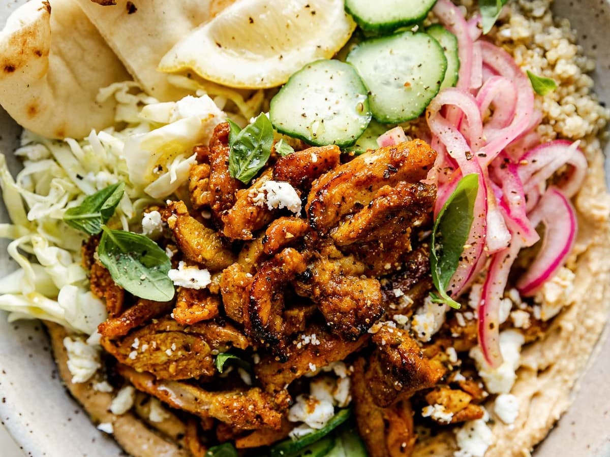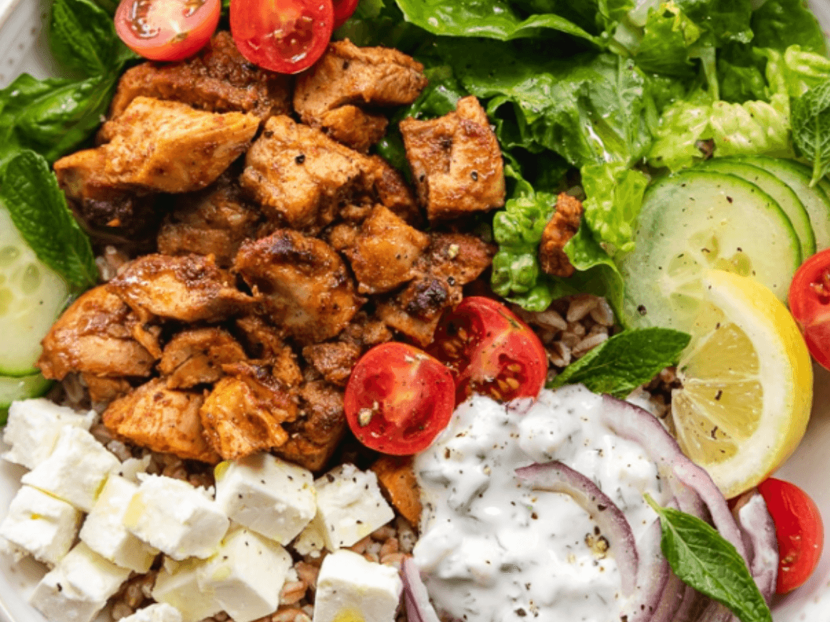 This Middle-Eastern Street Food dish is packed full of flavour and makes for a perfect light dinner or delicious lunch. Free Range Chicken is smothered in a spice rub of sweet paprika, oregano, local orange, wild garlic and a hint of chilli and char grilled. Sided with a creamy tahini dressing and soft feta cheese, pickled onion and a toasted garlic flat bread. So delicious and high in protein, nutrients and fibre for great gut health.