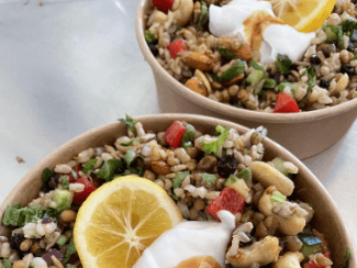 Loaded with healthy seeds and nuts. High in fibre and full of flavour. Finished with a twangy dressing of pomegranate yoghurt.