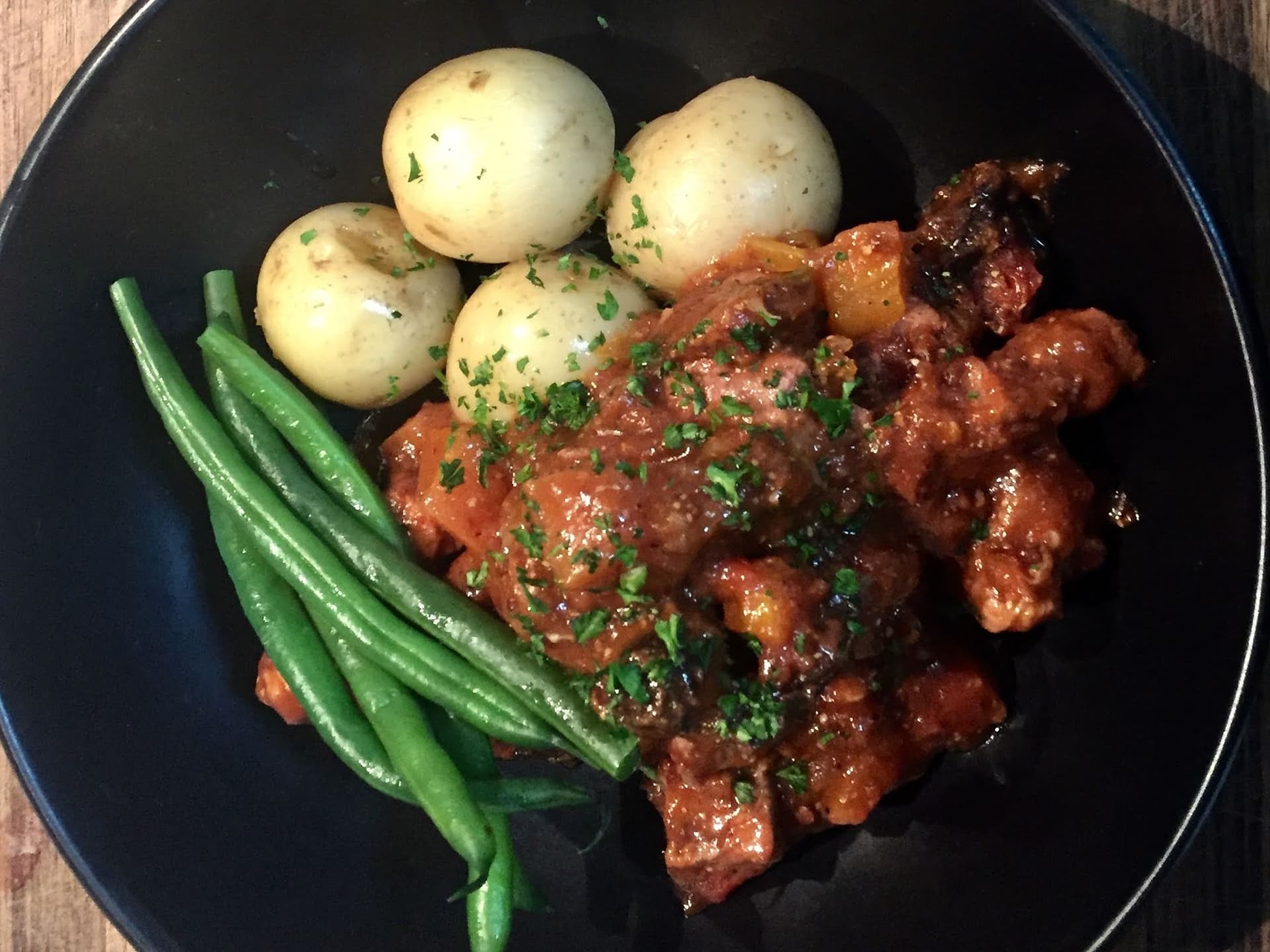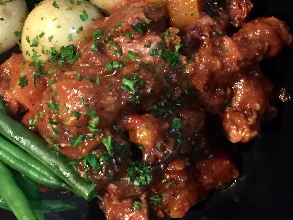 A big bowl of comfort food! Grass-fed Beef, onions, garlic, mushrooms and chunks of rendered bacon in a rich red wine sauce. It doesn't get much better than this. Our bourguignon is sided with fresh greens and steamed chat potatoes with parsley.