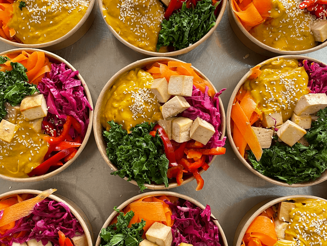 A colourful bowl of goodness. So tasty and super-charged with nutrients. Toasted tamari tofu, crunchy veg on a bed of organic black rice. The creamy satay sauce will have you munching this bowl down and enjoying every minute.