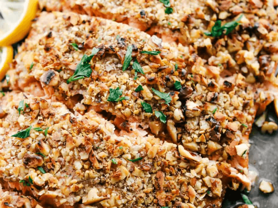 This Crusted Salmon is a show stopper! A super crunchy crust of almonds and parmesan, its a light and healthy meal for one. The Salmon roasted fillet is sided with steamed vegetables and a beautiful hearbed butter sauce. A very special dish and it's good for you!! - This dish is high in omega 3's - great for brain health and provides essential fats for the body.