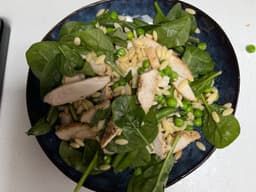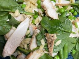 Peas, Chicken breast, Lemon juice, Risoni (Wheat), Green beans, Spinach English, Mustard (Milk), Parsley, Garlic, Shallots, Black pepper