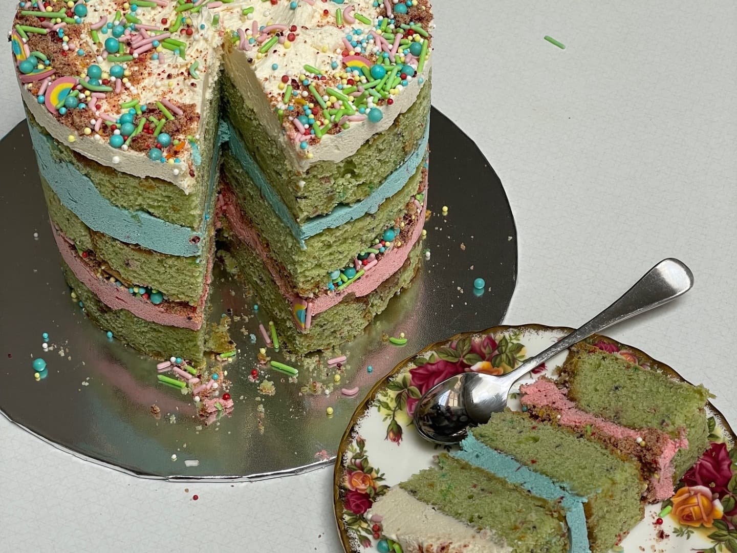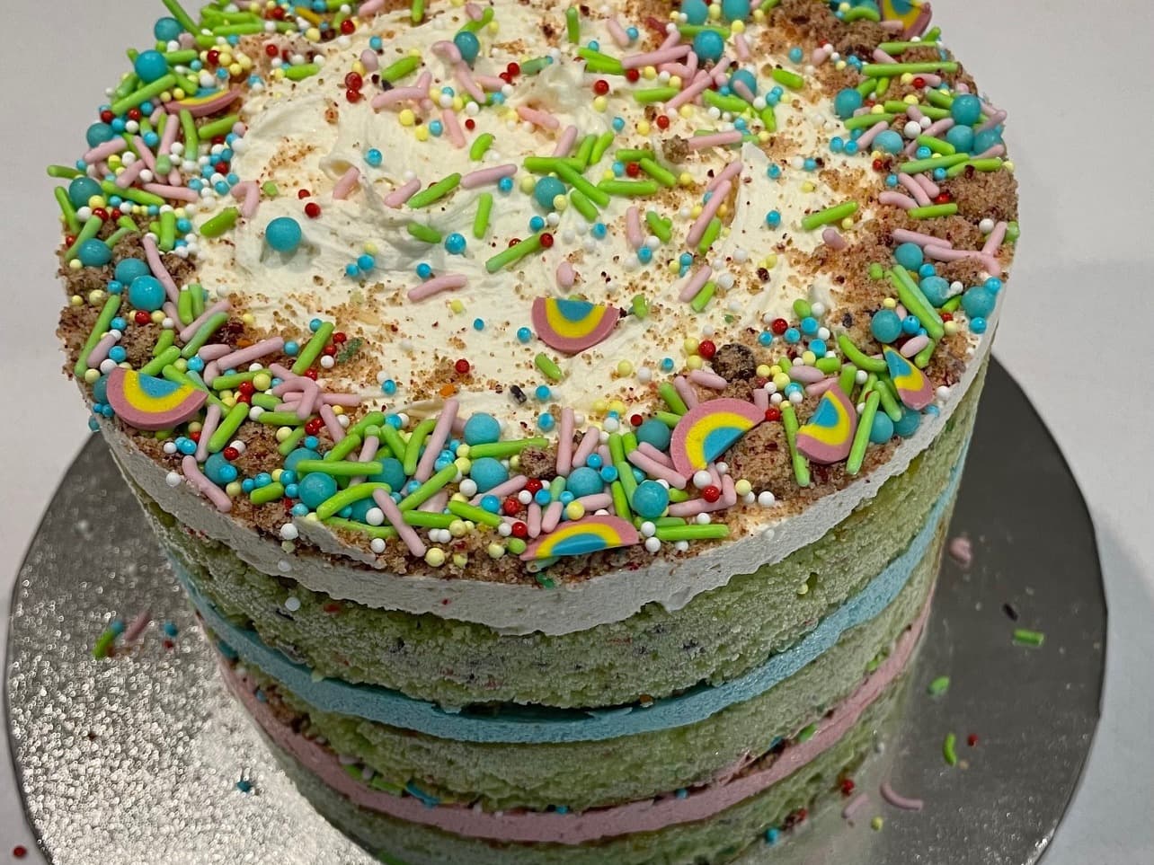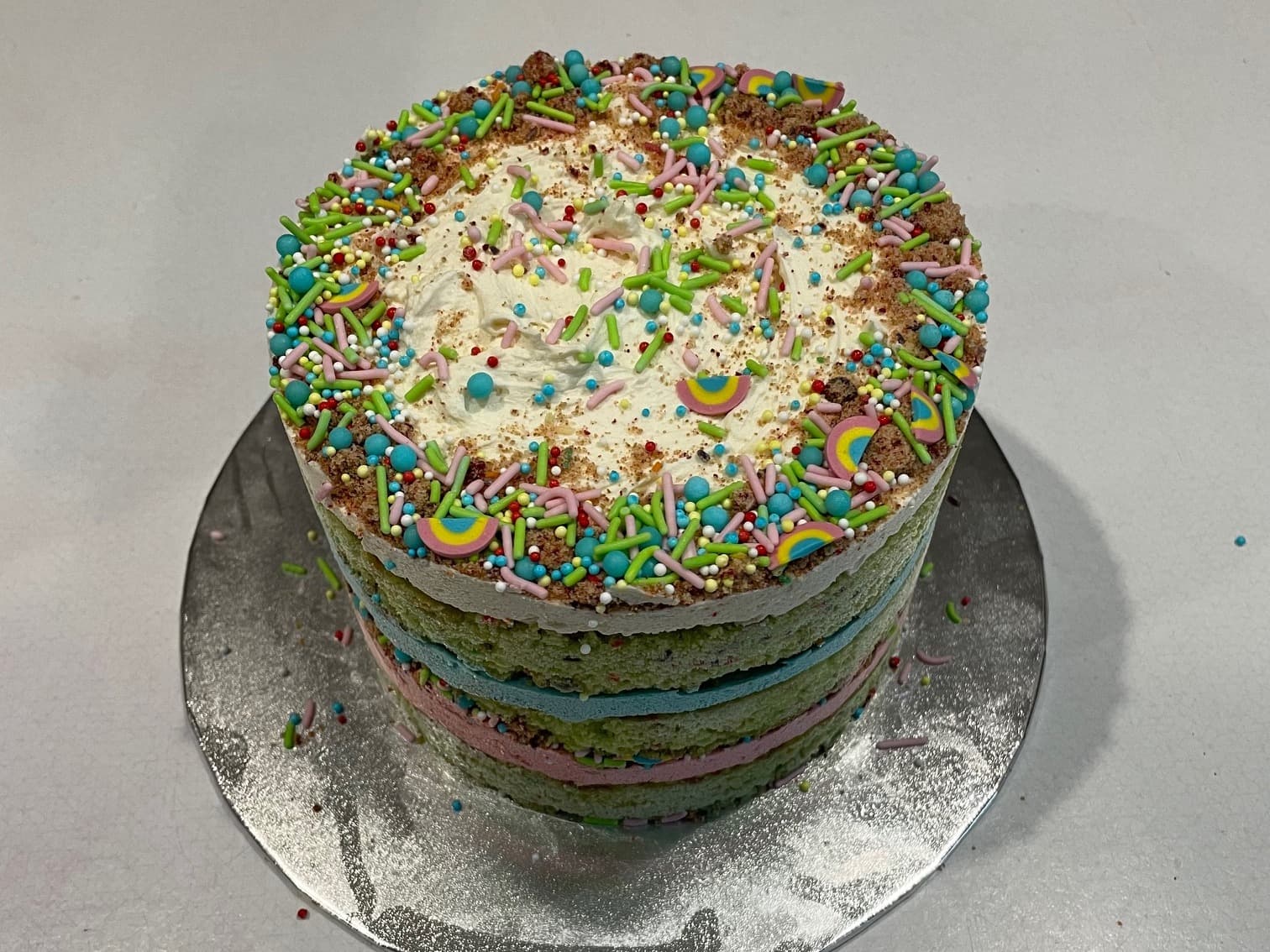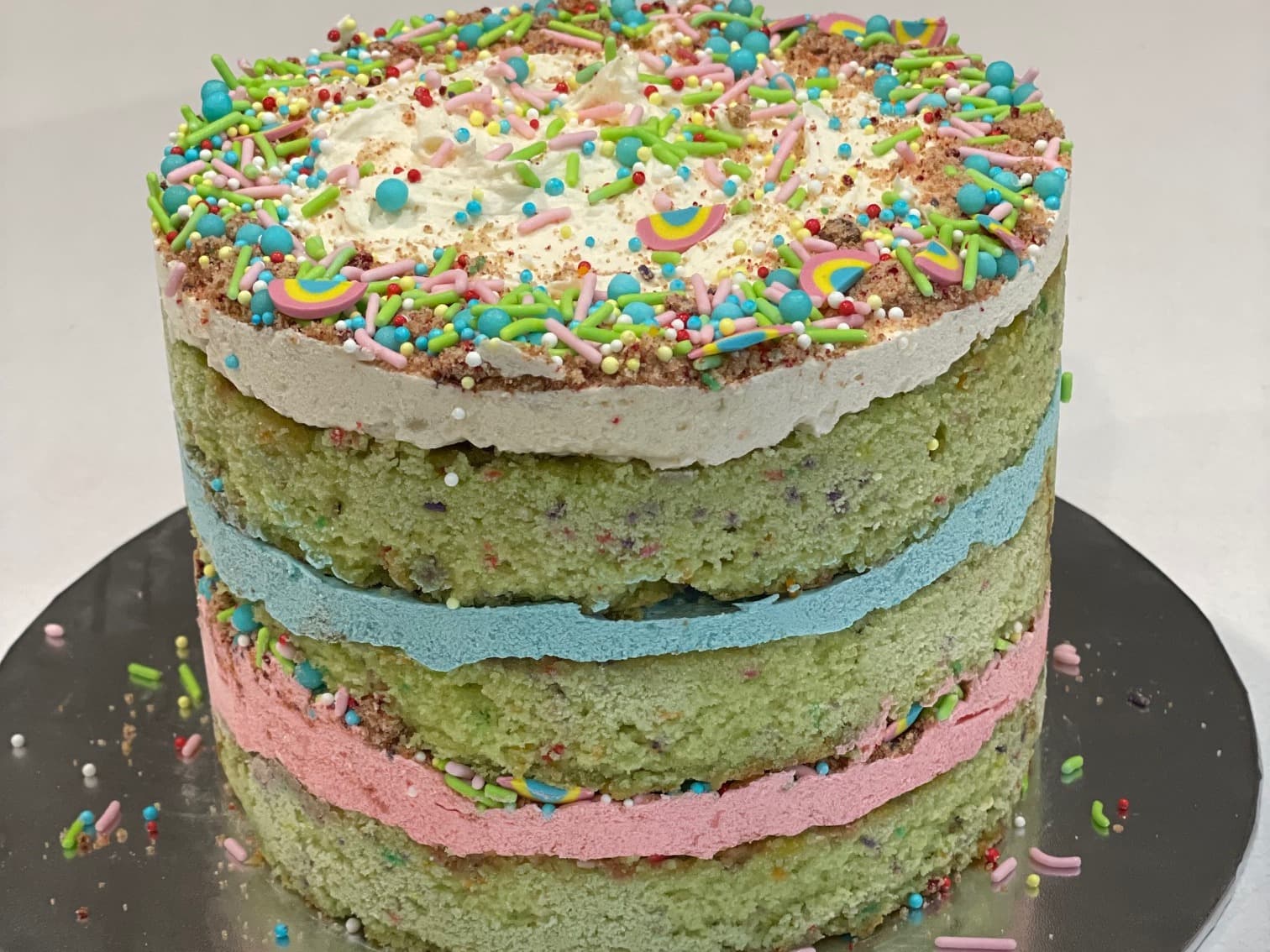 Indulge in The Baking Lady's irresistible party cake, which features layers of butter cake, creamy filling, crunchy crumbs, and a burst of rainbow sprinkles. Choose from pink, blue, or multi-colored options to add some fun to your celebration!