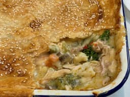 Chicken breast, Water, Frozen veg, Cream light (Milk), Puff pastry (Wheat, Milk), Mushrooms, Onion Brown, Plain flour (Wheat), Celery, Margarine, Egg yolks, Sesame seed, Chicken stock salt reduced