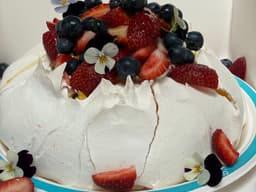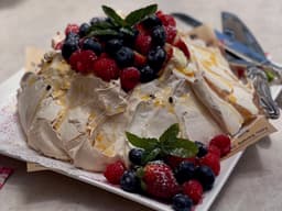 Sugar, caster, Cream light (Milk), Egg white, Strawberries, Blueberries, Passionfruit, Cornflour (GF), Wine vinegar, Salt, Vanilla extract