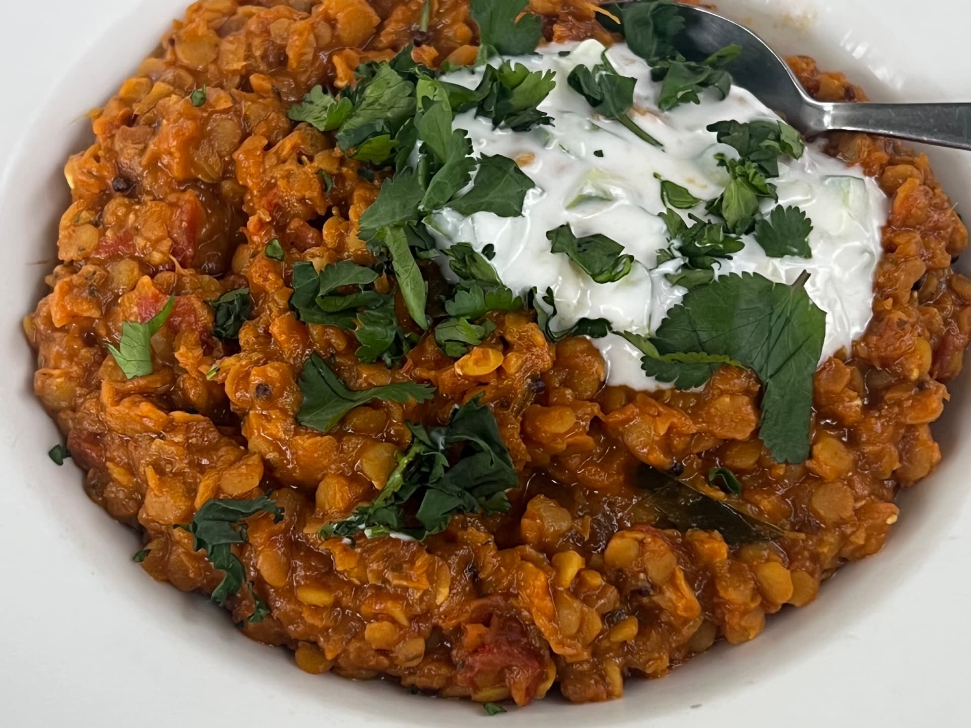 A mild, comforting, aromatic bowl of red lentils gently simmered with mustard seeds, cumin, turmeric, tomatoes with fresh coriander and curry leaves. Finished with lime and a cooling cucumber yoghurt, this dish balances warmth and brightness in every bite. A vibrant twist on classic dhal, hearty, nourishing, and perfect for a standalone lunch or on top of rice. (Dairy-free yoghurt available, please choose vegan option).