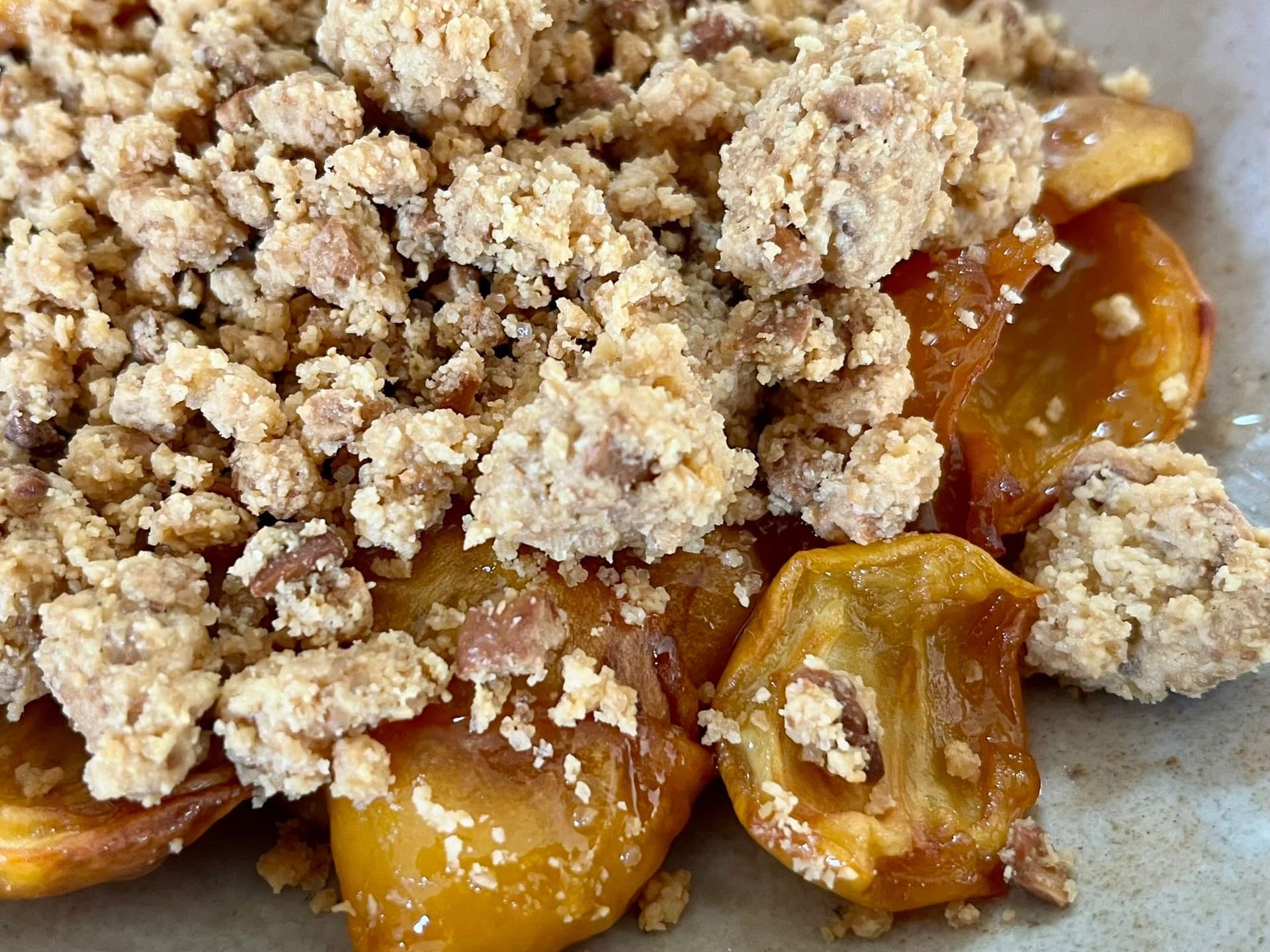 Loquats are a true spring fruit that grow abundantly in yards all around Melbourne. They are botanically related to apples and quinces. These particular loquats were grown by a friend just around the corner. We've roasted them until juicy with raw sugar and vanilla and then topped them with a nutty gluten free crumble. Please note that while the crumble is not technically dairy free, we have used ghee instead of butter, which is tolerated well by many people with dairy allergies or intolerances.
