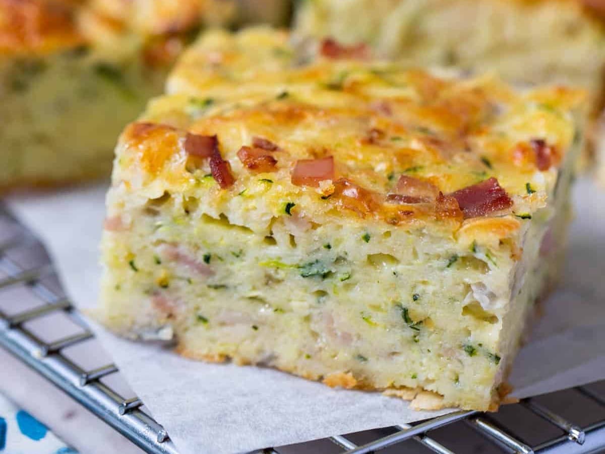 Yummy Zucchini Slice featuring grated zucchini, cheese, bacon and onion in a light egg base, this classic Aussie Slice is great eaten hot or cold, making it perfect for lunchboxes, light lunch, afternoon tea or dinner.