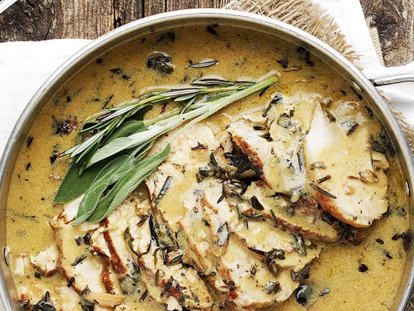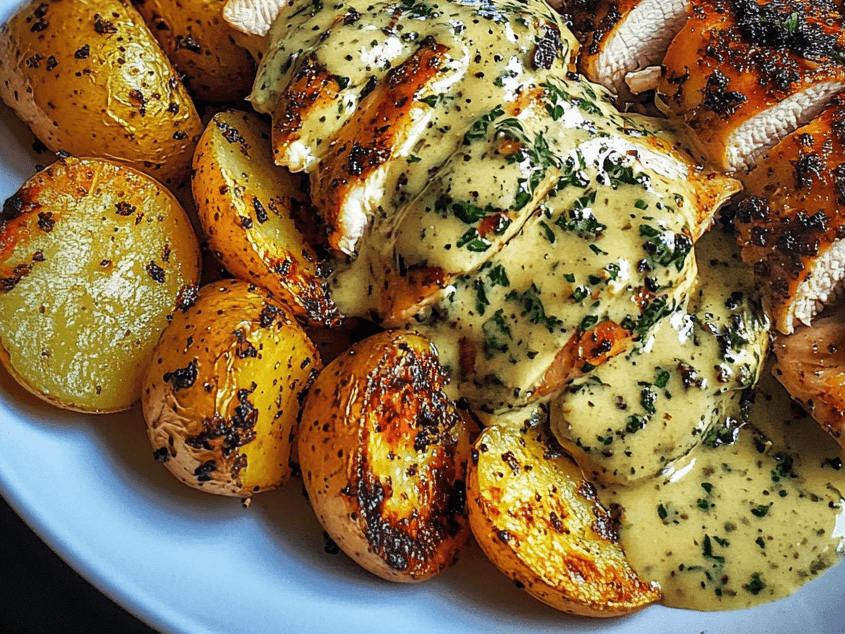 Chicken seasoned & sous vide to lock in the moisture, then lightly seared and dressed with a decadent creamy garlic sauce. Complemented by crispy roasted potatoes and vegetables