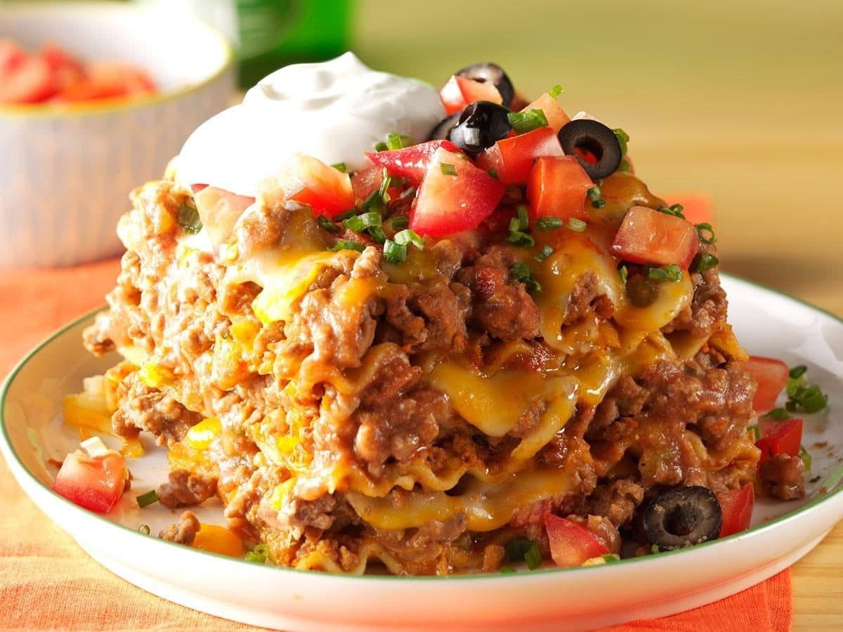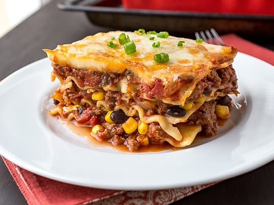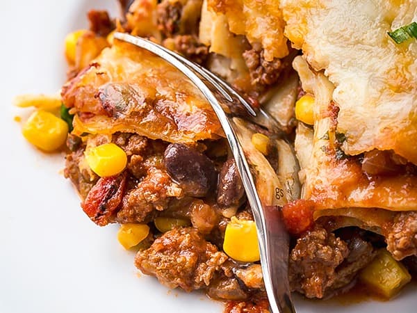 This Mexican lasagne is packed with all the good stuff — beef, beans, capsicum, corn, and loads of melty cheese — all layered between soft tortillas. It’s like tacos and lasagne had a delicious baby! Perfect for feeding the family and it’s even better the next day! Topped with guacamole, sour cream and spring onions, perfect crowd pleaser!