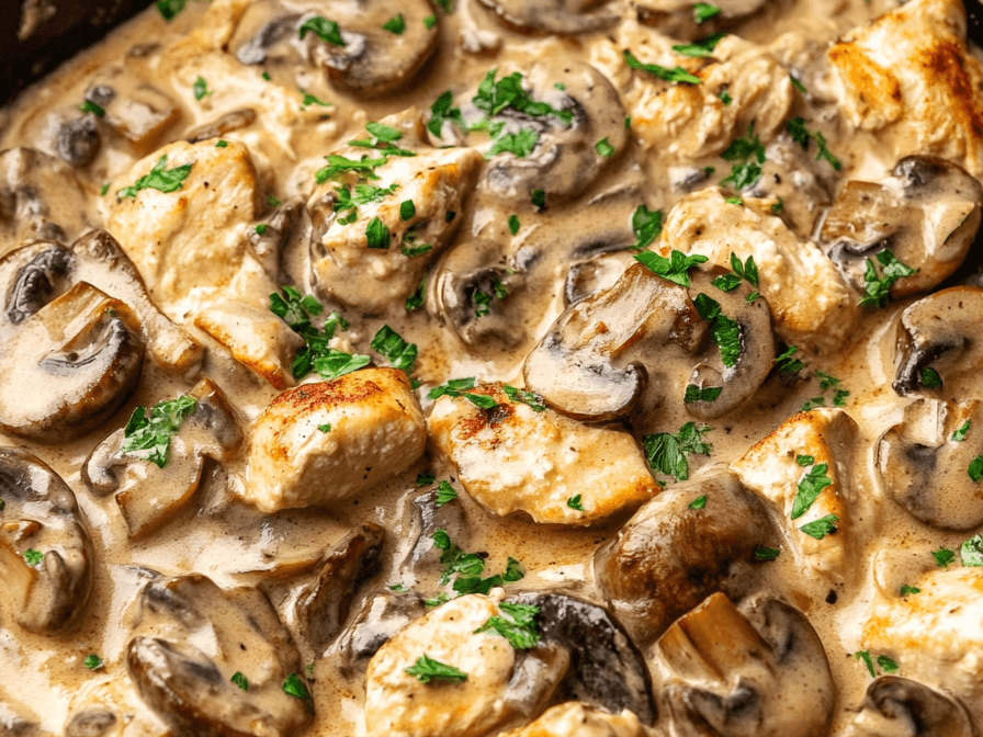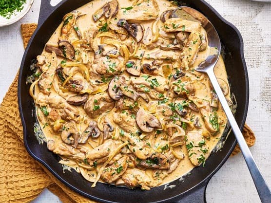 You love Beef Stroganoff...now try CHICKEN! Golden seared chicken with a creamy mushroom Stroganoff gravy!
