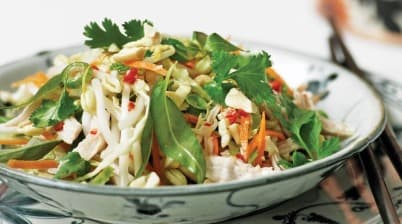 This is a standout Vietnamese salad that is a meal of its own. Instead of chicken, I press and fry tofu in a salt and pepper mix. This is served on top of an Asian coleslaw, with deep fried garlic, lashings of Vietnamese mint and coriander and deep fried shallots. It is dressed with a rice vinegar dressing and eaten with toasted sesame crackers. A luxury salad and one of my favourites!