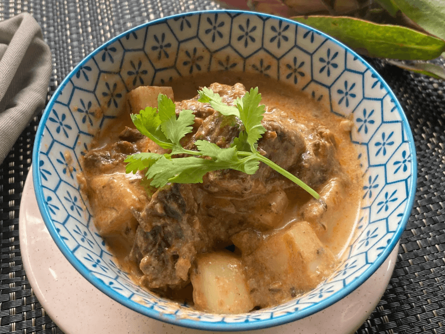 Slow Cooked Beef & Potatoes in Fragrant Coconut Curry Sauce Served with Steamed Rice & Green Beans.