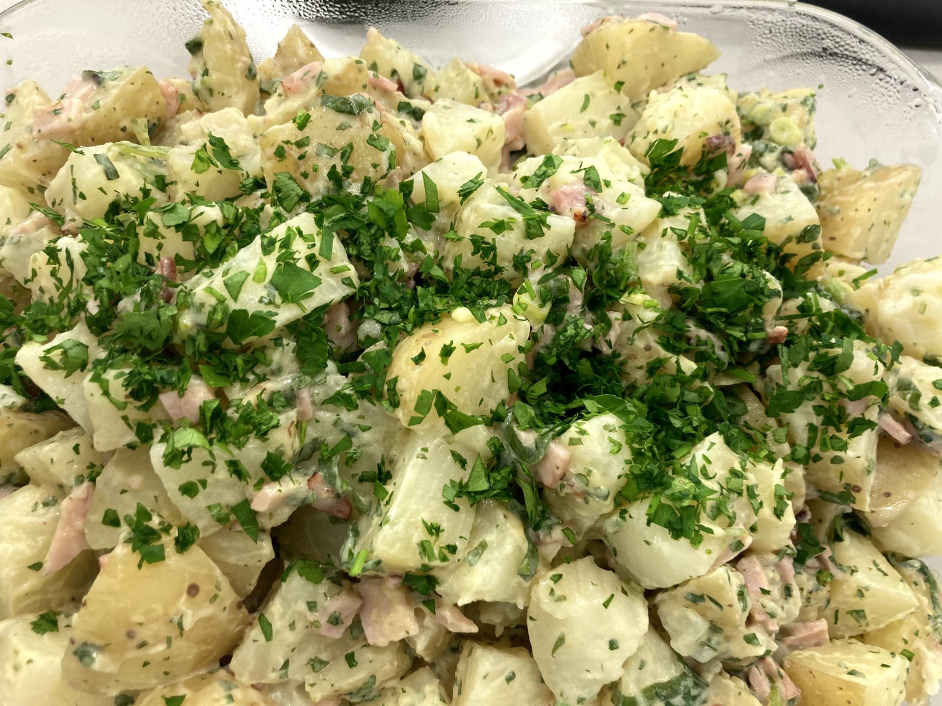 Creamy Potato Salad mixed with celery & red onion in homemade aioli (NO HAM)