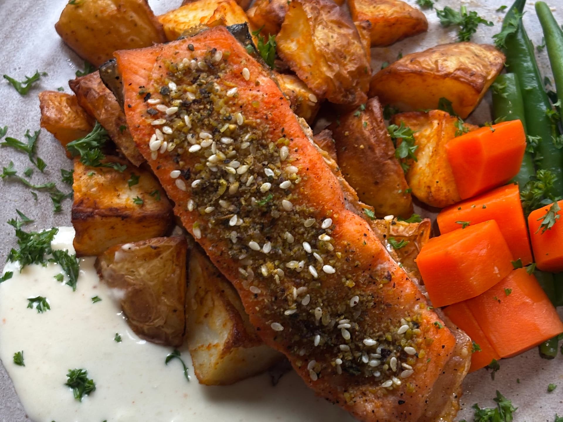 Served with Lemon Dill Aioli, Roasted Potato & Seasonal Vegetables (Baked Carrots & Beans)